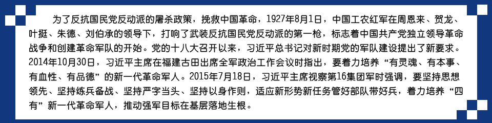 八一建军节前夕,中共中央总书记、国家主席、中央军委主席习近平18日下午专门来到第16集团军视察时强调,要坚持思想领先、坚持练兵备战、坚持严字当头、坚持以身作则,适应新形势新任务管好部队带好兵,着力培养有灵魂、有本事、有血性、有品德的“四有”新一代革命军人,推动强军目标在基层落地生根。